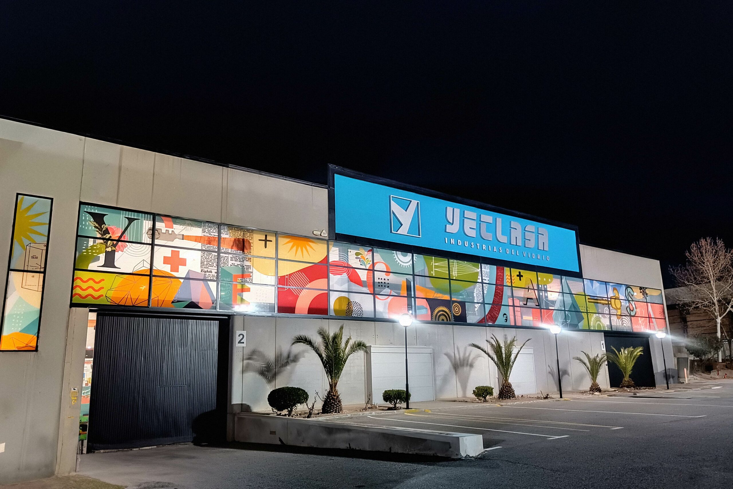 Conjunto de murales diseñados para la empresa Yeclasa, aprovechando su tecnología de impresión en vidrio para crear una composición en toda la cristalería exterior de sus instalaciones. El color es el protagonista de estas composiciones que sirve también como homenaje a la artesanía de manufacturación del vidrio y los orígenes de la empresa.