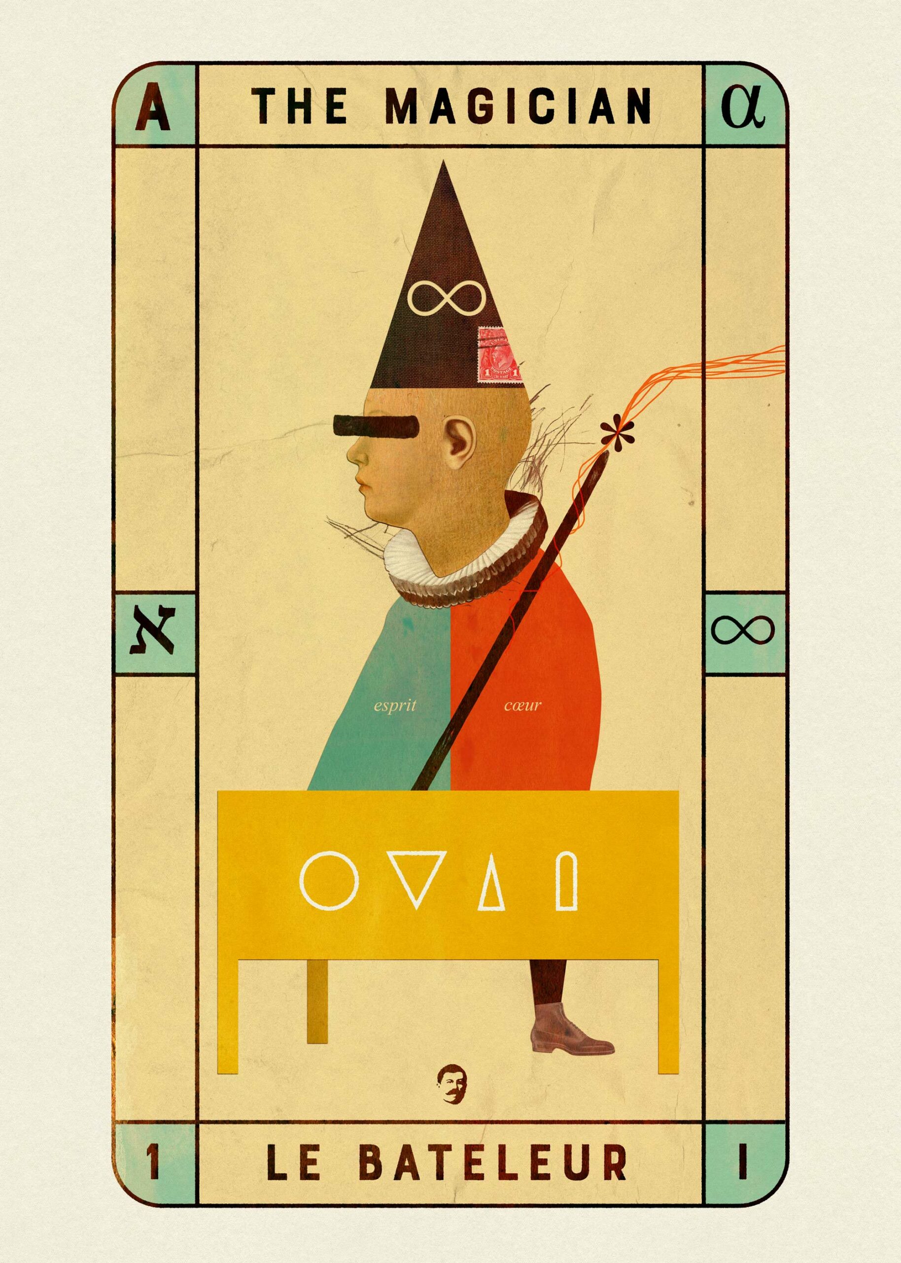 El mago es un hombre, se halla de frente con los pies firmemente asentados en el suelo y con la cabeza inclinada hacia la izquierda, lo que sugiere una acción directa predicha de suficiente reflexiónEn la carta le acompaña una Mesa incompleta, en el de Marsella con tres patas. La cuarta pata no se ve porque representa «lo que no vemos» pero que está supuesta. Vemos también que una de sus piernas sustituye a esa pata desapercibida pues él mismo se funde con su trabajo. En otros tarots no se muestra toda la mesa. Suele venir acompañada igualmente de plantas en el suelo donde se percibe que es un campo. El mago trabaja con los cuatro elementos: Bastos, Copas, Espadas, Oros.